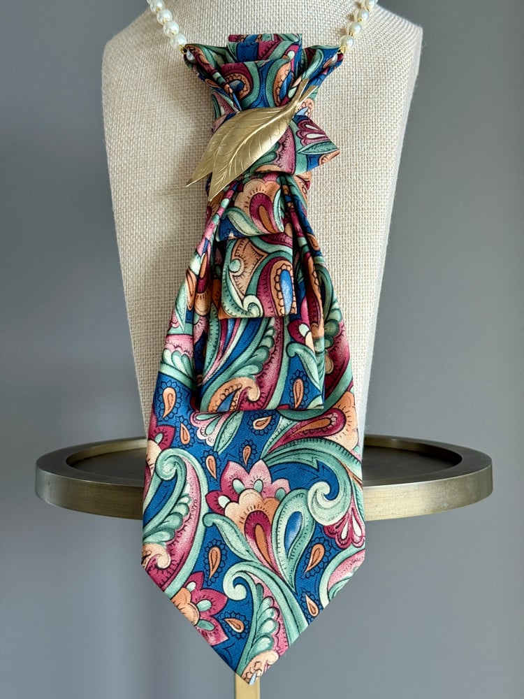 A poetic swirl of color and grace, Autumn Muse captures the elegance of vintage bohemian charm. The paisley silk tie dances with hues of deep teal, rose, and soft gold—like falling leaves in late afternoon light. A golden leaf brooch rests at the neckline, symbolizing renewal and creative spirit, while the pearl-and-stone chain adds a touch of timeless femininity. This piece whispers of art studios, candlelight dinners, and confident, free-spirited women who know their style tells a story.