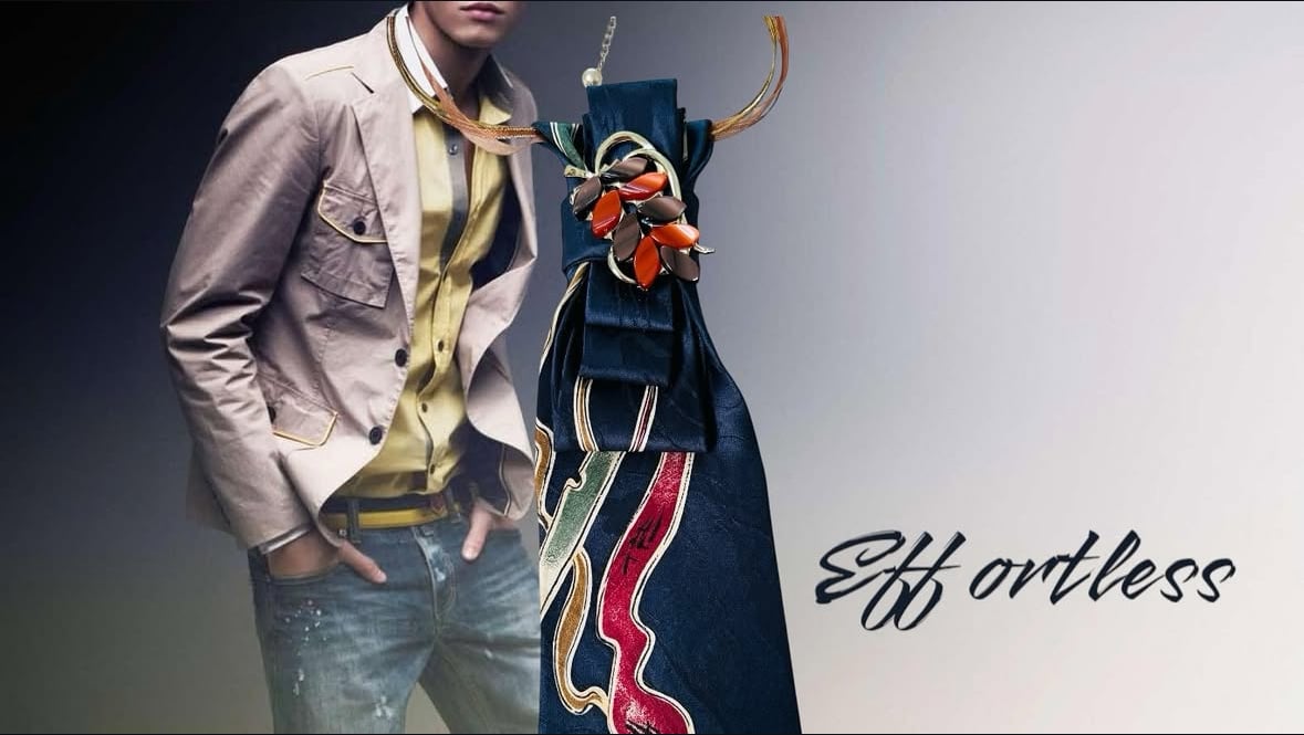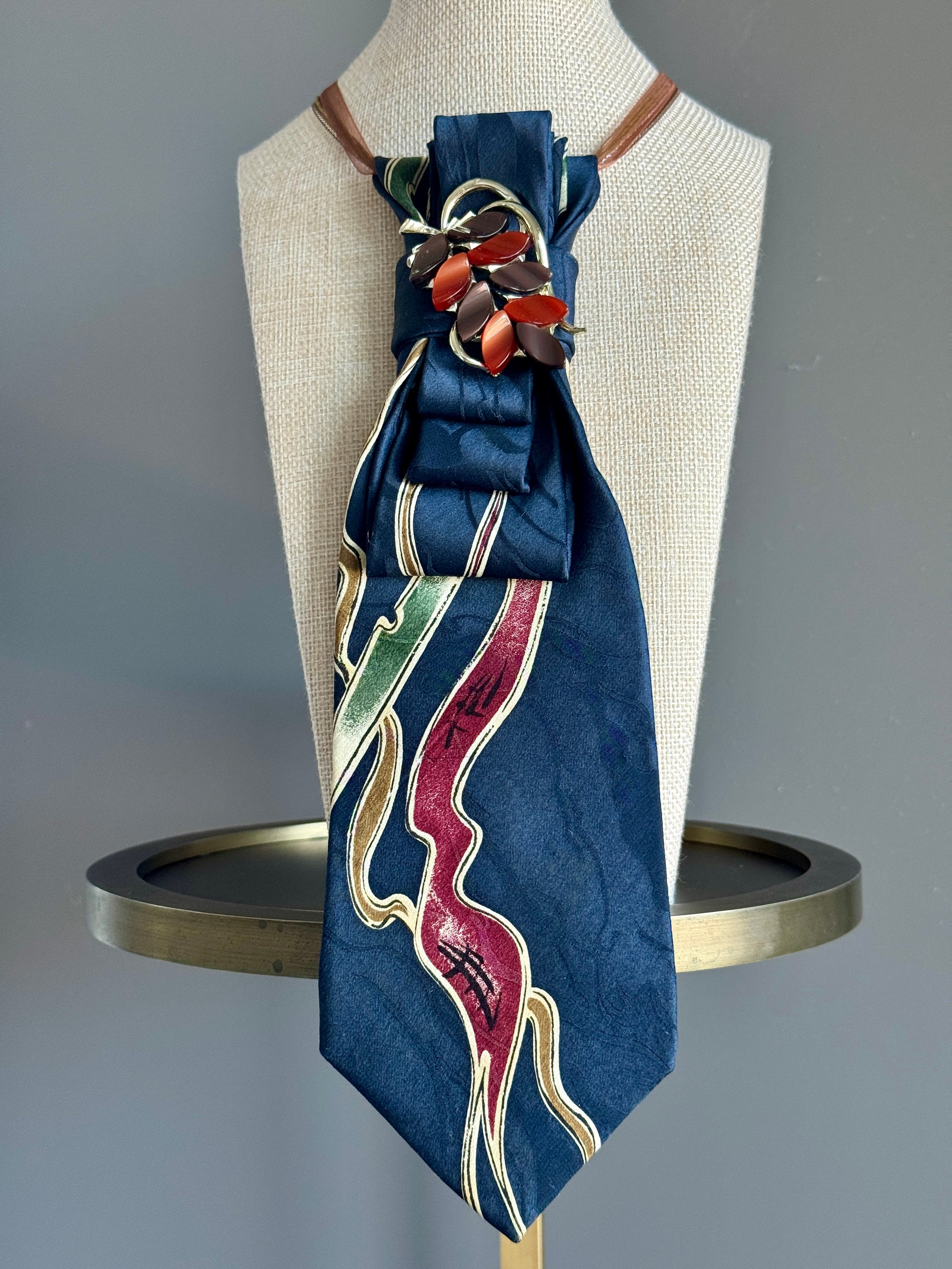 This one-of-a-kind UpTie flows with artistic energy. A dark navy silk canvas features a sweeping ribbon of earthy hues—terracotta, sage, burgundy, and taupe—evoking movement like a river of falling leaves or an abstract landscape at dusk. The sculptural vintage brooch, with curved leaves in warm reds and browns, adds a rich dimensional accent. Finished with a sheer copper and suede cord, this piece blends vintage drama with modern expression—perfect for the woman who lives in full color.