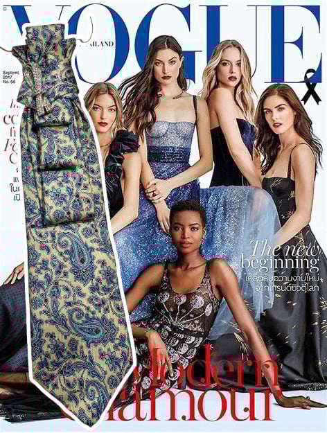 A dreamy blue paisley on cream, accented with a rhinestone bow brooch. Light, elegant, and full of soft vintage charm.