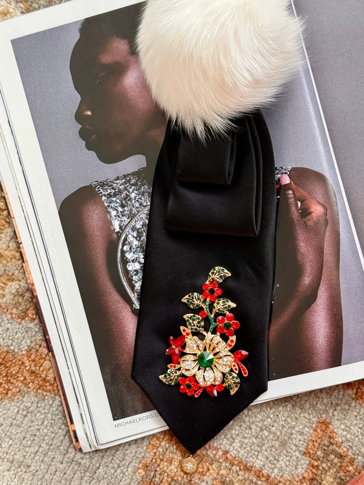 Anchoring the lower half is a jaw-dropping vintage-style Christmas brooch, bursting with ruby-red berries, emerald cabochons, gold filigree leaves, and a sparkling crystal poinsettia bloom at the center. It’s festive, elegant, and wildly chic without a single ounce of kitsch.