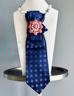 A navy violet-dot base gets a burst of floral joy with a radiant red and crystal bloom brooch. Bold, bright, and bloomig with personality.
