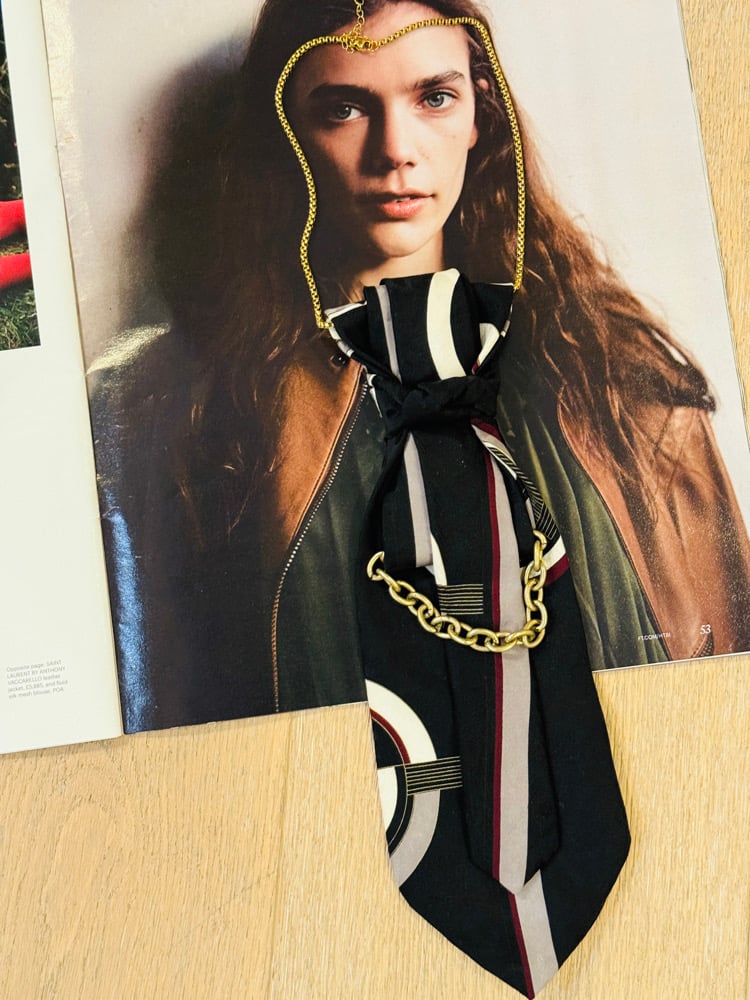 Metro Noir is the embodiment of modern sophistication with a whisper of rebellion. Crafted from a sleek vintage silk tie in jet black with bold ivory and crimson stripes, it channels the energy of city lights reflected on wet pavement. The chunky gold chain draped across the front adds an edge of urban glamour—equal parts power and polish.