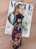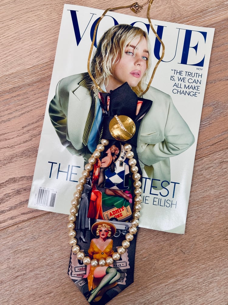 Then comes the pièce de résistance:a loop of oversized vintage-style pearls wrapped around the central pin-up artwork like a glamorous neckline. It instantly transforms the piece into wearable art that’s sexy, campy, elegant, and fun all at once.
