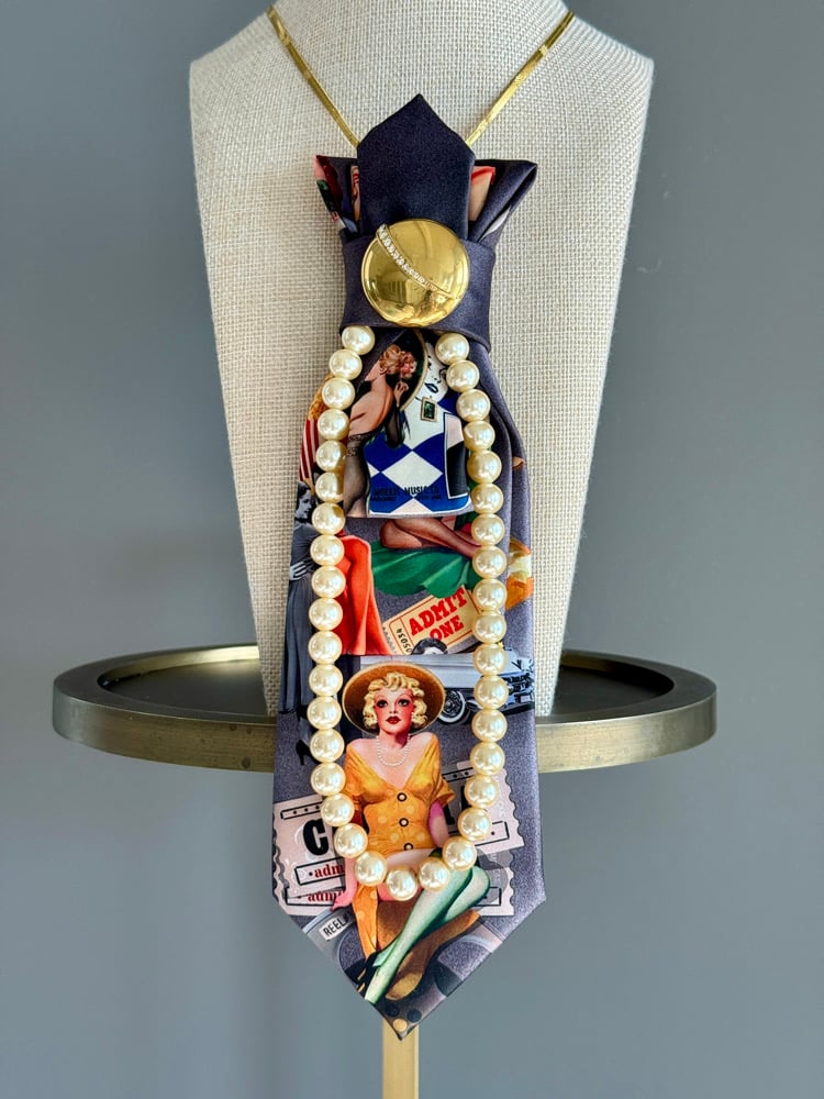 Pin-Up Premiere is crafted from a retro-print silk tie featuring classic pin-up girls, old-school movie tickets, reels, and pop-art style graphics — a nostalgic throwback to Hollywood’s golden age with a cheeky twist.