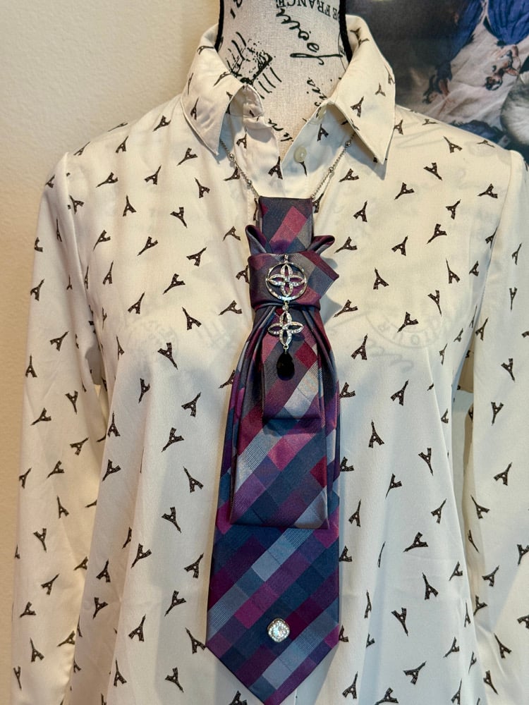 Commanding yet refined, Royal Checkmate is the definition of power in pattern. Its deep plum, charcoal, and silver-gray plaid silk base sets a regal tone, elevated by a double-tiered crystal cross accent and a bold onyx teardrop gem. A single rhinestone jewel anchors the bottom—a perfect finishing move for a queen who knows how to play her style game.