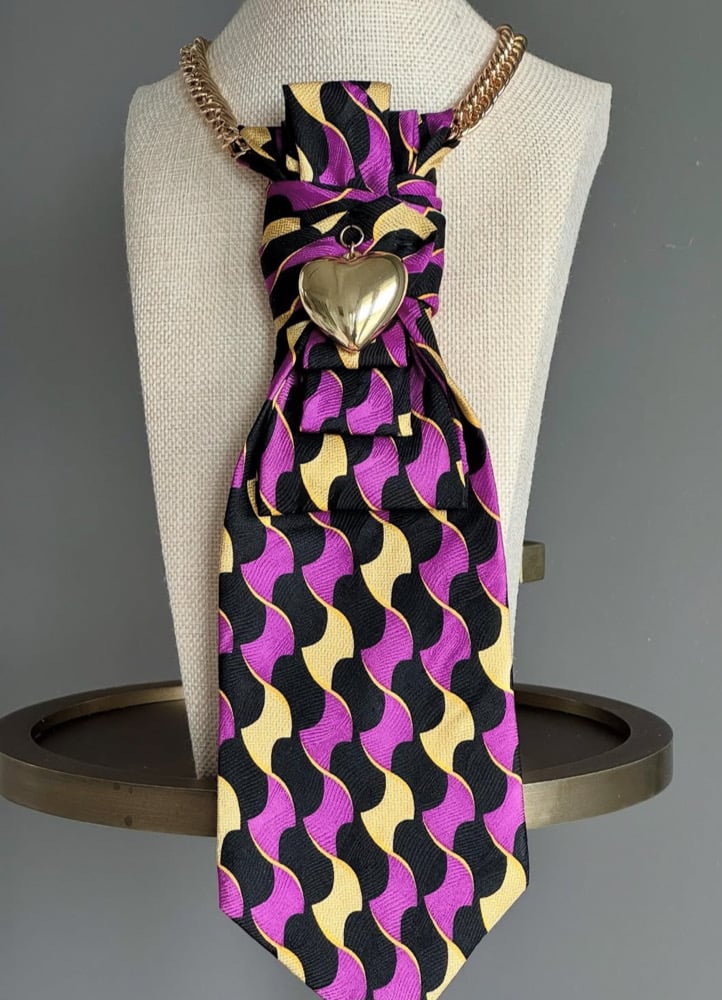 Get ready to fall head over heels. This striking UpTie features a wavy retro print in deep purple, gold, and black — folded and hand-stitched to perfection. At the center, a gleaming gold puffed heart charm swings from the knot, adding just the right touch of sparkle and soul. Suspended from a chunky gold chain, this piece brings serious rhythm and bold romance to any outfit.