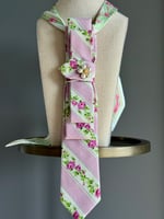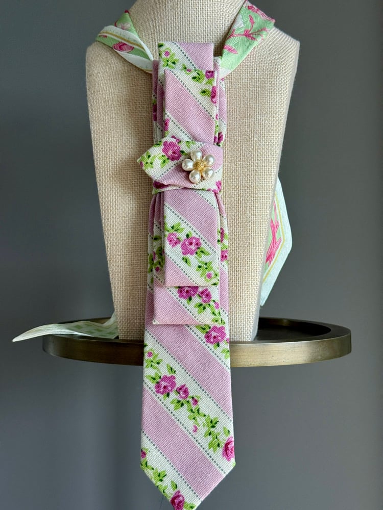 Soft, feminine, and utterly enchanting, Tea Rose Charm feels like a stroll through an English garden at golden hour. This UpTie blends blush pink and cream stripes with dainty rosebuds, finished with a pearl-and-gold flower brooch that sparkles like morning dew. The mint-green floral neck ties add a romantic twist, turning this piece into a sweet harmony of vintage whimsy and modern grace.